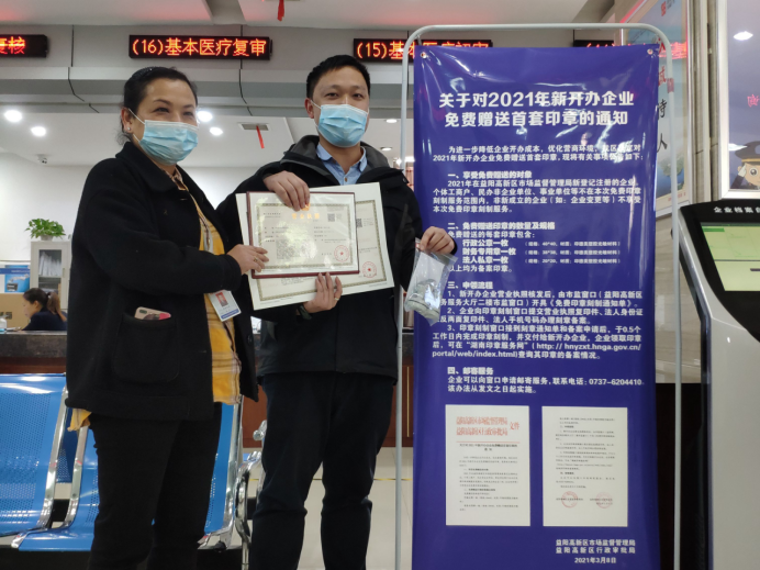 “感谢政府部门的优质服务,让我们新开办的企业不花钱就能领到全套印章。”3月11日,新开办的湖南欣诚工程技术有限公司法人代表刘辉微笑着从益阳高新区政务服务大厅二楼市监窗口领取了营业执照和首套政府买单印章,成为第一批受益企业。据悉,益阳高新区是我市首个实施新开办企业免费赠送首套印章的区县。 自今年3月8日起,为进一步降低企业开办成本,优化营商环境,由益阳高新区市场监督管理局、益阳高新区行政审批局为2021年新开办企业(不包含个体工商户、民办非企业单位、事业单位)免费赠送首套印章。每套印章包含行政公章一枚、财务专用章一枚、法人私章一枚,市场价值419元。