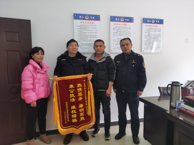 近日,山东省张先生给赫山区市场监管局赫山市场监管所送来一面锦旗,“热情服务、廉明高效,秉公执法、维权楷模”,字里行间表达了对赫山区市场监管局维权工作的肯定与感谢。