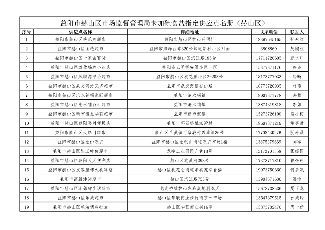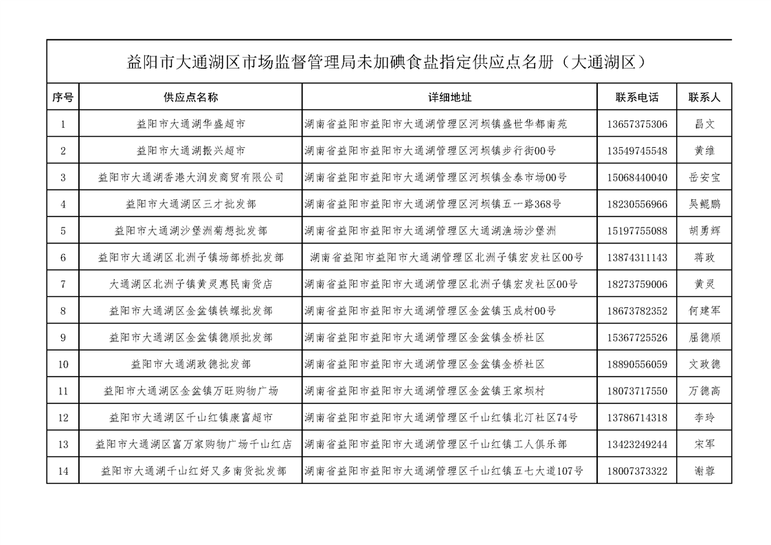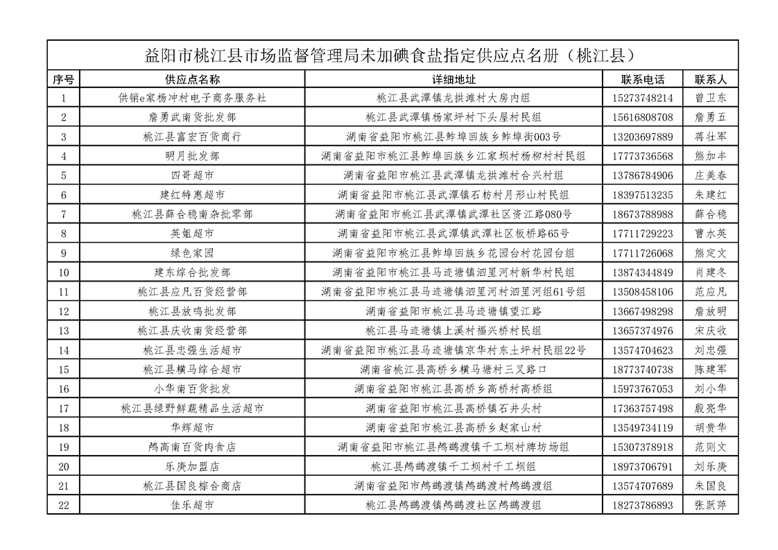 为进一步加强全市食盐专营管理,规范未加碘食盐供应,根据湖南省市场监督管理局《关于进一步规范未加碘食盐供应和管理的通知》要求,全省未加碘食盐由湖南盐业股份有限公司负责统一供应。现将湖南盐业股份有限公司益阳市分公司在益阳辖区内销售未加碘食盐供应网点信息予以公示。请需要购买未加碘食盐的特定人群消费者遵医嘱购买。