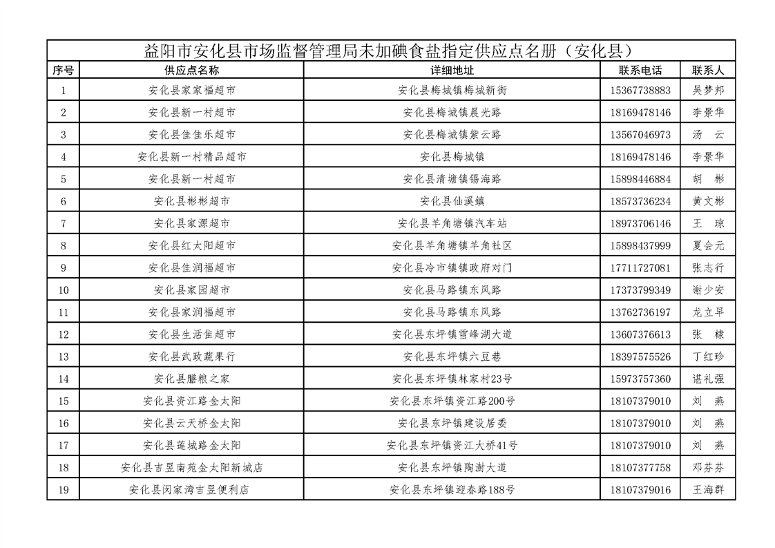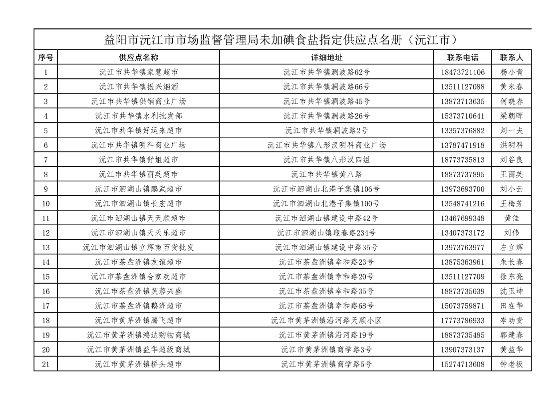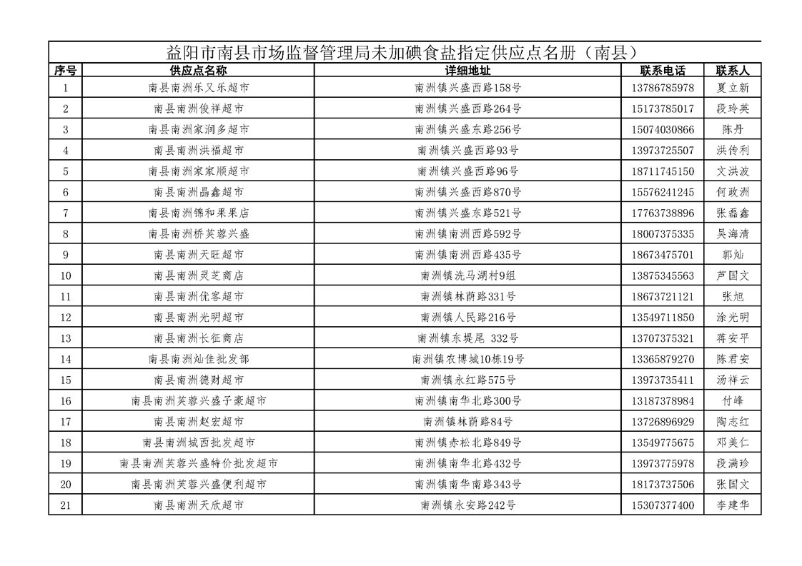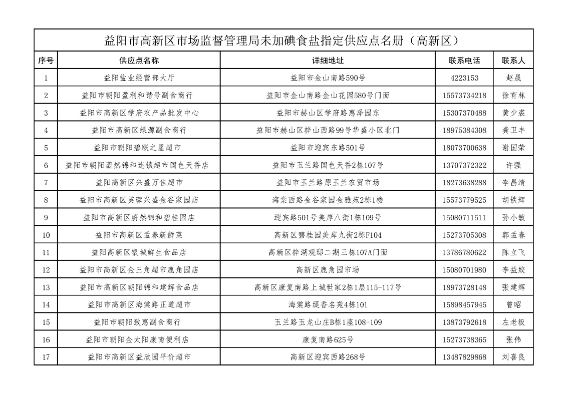 为进一步加强全市食盐专营管理,规范未加碘食盐供应,根据湖南省市场监督管理局《关于进一步规范未加碘食盐供应和管理的通知》要求,全省未加碘食盐由湖南盐业股份有限公司负责统一供应。现将湖南盐业股份有限公司益阳市分公司在益阳辖区内销售未加碘食盐供应网点信息予以公示。请需要购买未加碘食盐的特定人群消费者遵医嘱购买。